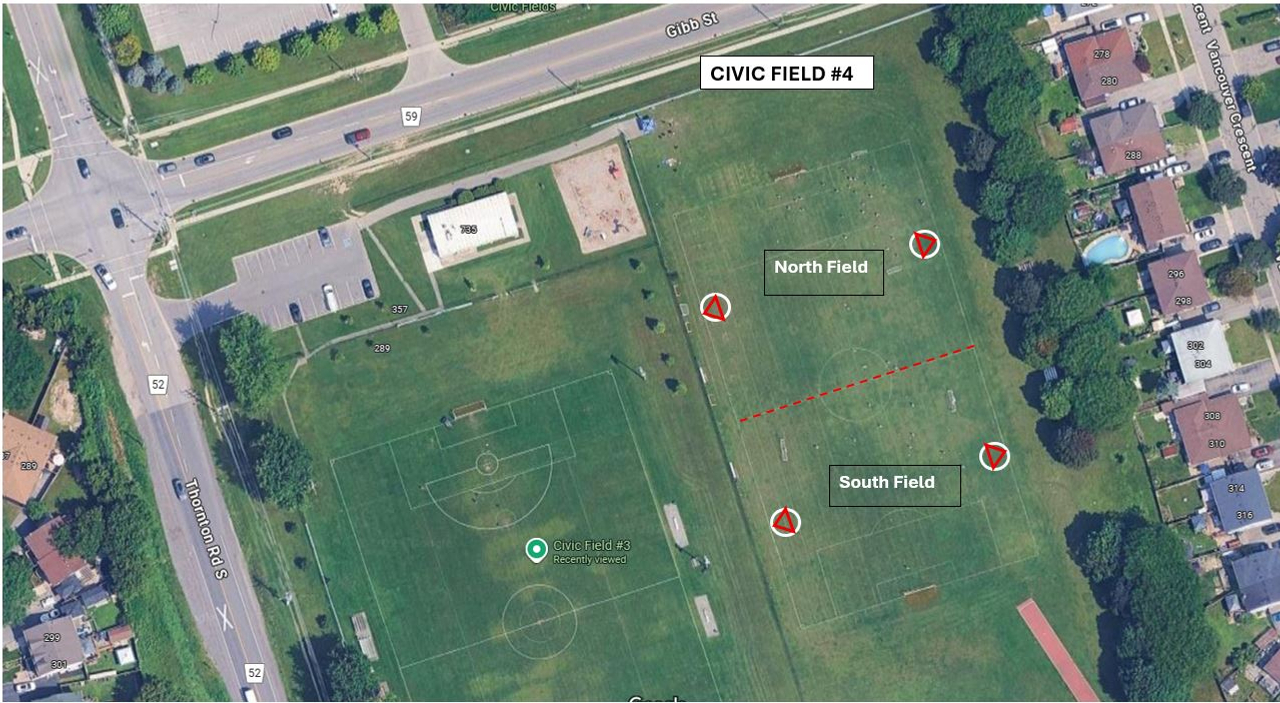2025 Oshawa Fall Ball Sixes Field 4 MapThere are parking lots on both sides of Gibb at the Civic Field complex as well as road parking on Thornton South. Washrooms are in the clubhouse between the parking lot and playground.